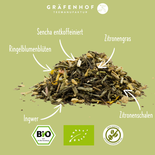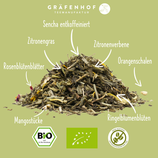 Für Fruchtliebhaber empfehlen wir unseren BIO Pfirsich Orange oder BIO Mandarine. Wenn du es erfrischend magst, probiere den BIO Marrakesch Mint. Ein besonderes Highlight ist unser BIO Ingwer Zitrone, der entkoffeinierten grünen Sencha mit belebenden Zutaten wie Ingwer und Zitronengras kombiniert – ideal für einen schwungvollen Start in den Tag.
