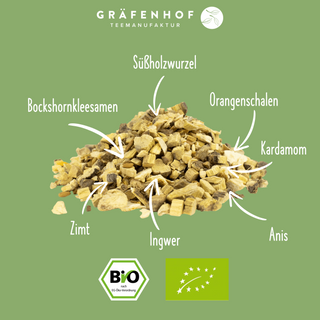 Diese natürlichen Inhaltsstoffe unterstützen das Wohlbefinden, wirken antioxidativ und werden in der traditionellen Heilkunst häufig bei bestimmten Beschwerden eingesetzt. Kamille gilt beispielsweise als beruhigend, Pfefferminze als erfrischend und verdauungsfördernd, während Ingwer die Abwehrkräfte stärken kann.